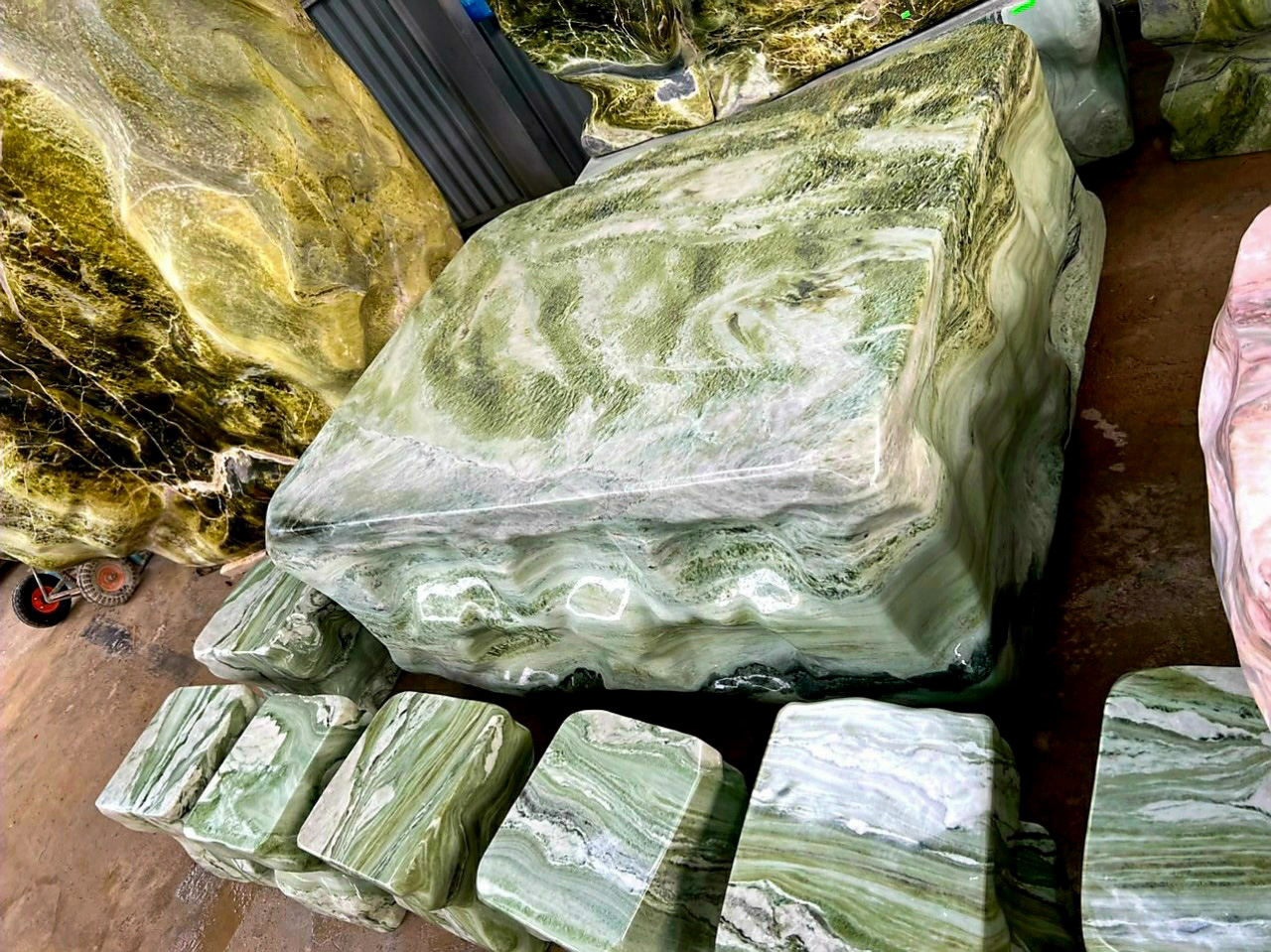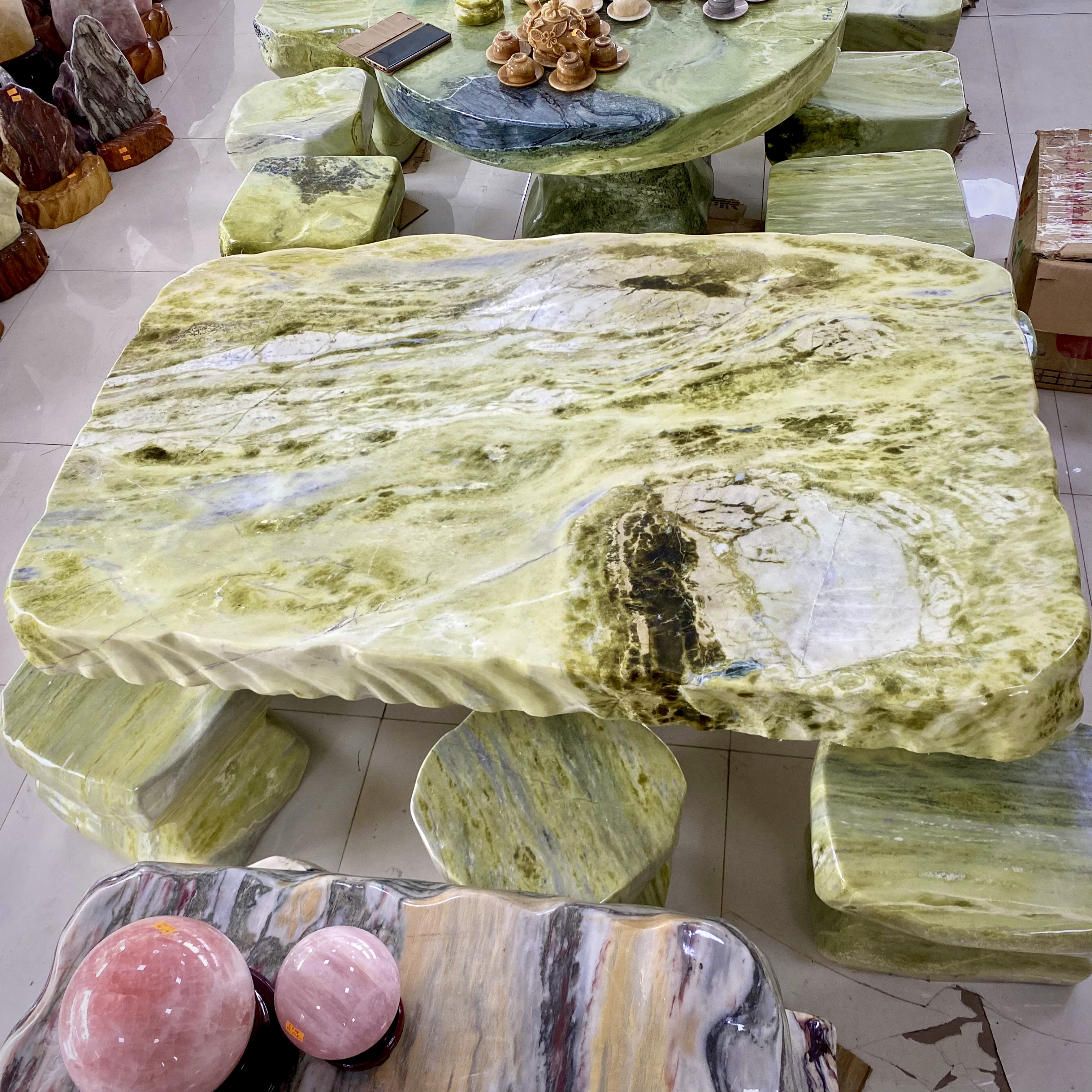 Bộ bàn ghế đá ngọc nguyên khối, kích thước 157 x 130 x 60 cm cùng 8 đôn ghế bằng ngọc cực sang trọng và đẳng cấp