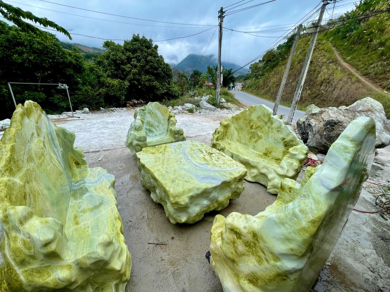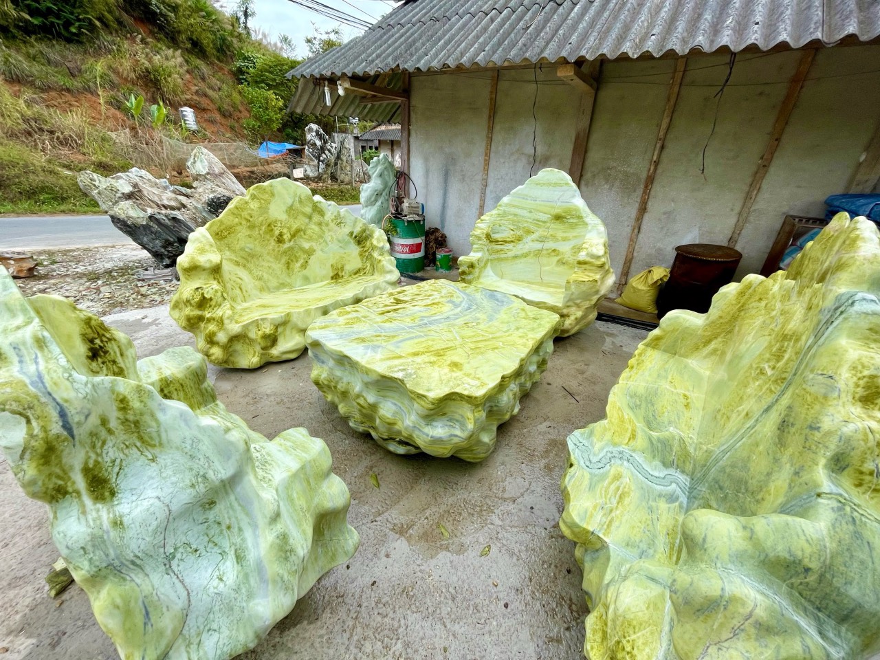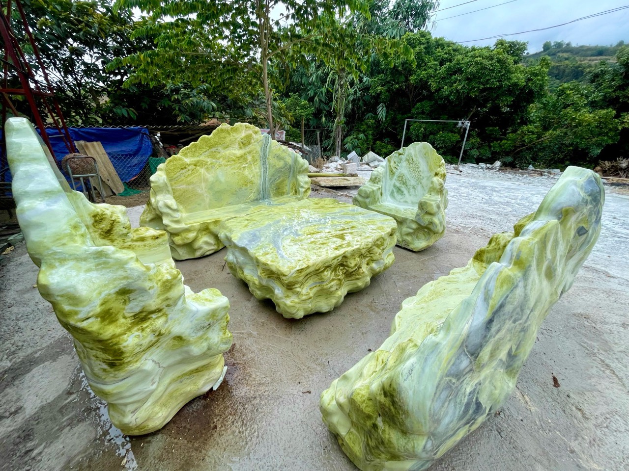 Bộ bàn ghế đá bằng ngọc tự nhiên nguyên khối không chỉ được gia chủ sử dụng để thưởng trà hay đãi khách mà nó còn là báu vật của thiên nhiên, là vật phẩm phong thủy trấn đất, trừ tà, mang lại nguồn năng lượng dương, nguồn sinh khí dương tươi mát, Bộ bàn độc đáo này là mồ hôi, là tâm huyết của những nghệ nhân nghề đá đã dồn cả vào đây, đây thự sự là tác phẩm nghệ thuật để đời cho bản thân và con cháu muôn đời sau, hiện bộ bàn đang được bảo quản tại thế giới đá quý, đá phong thủy, đường âu Cơ, TP Yên Bái, đt 0988367405