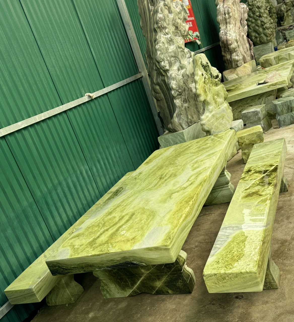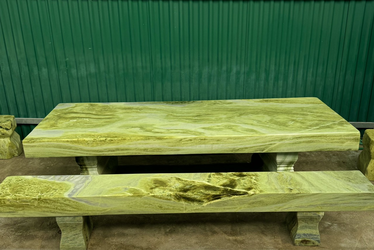 Đây là bộ bàn chế tác thủ công từ khối đá ngọc serpentine tự nhiên khai thác tại vùng mỏ đá quý Yên Bái. tổng trọng lượng của bộ bàn nặng khoảng trên 2 tấn.