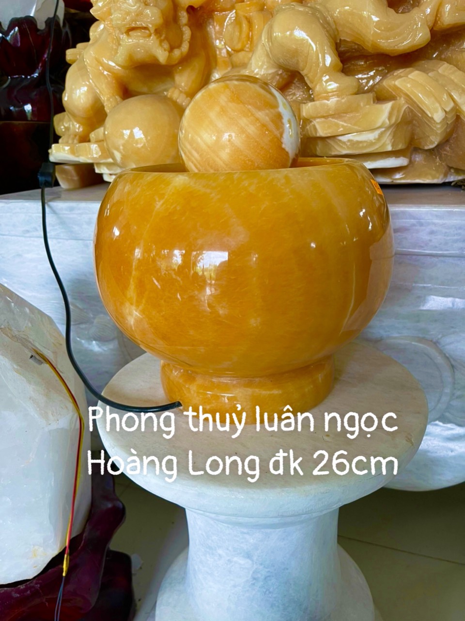 - Phong Thủy Luân Ngọc Hoàng Long được đặt trên đế gỗ sang trọng, tạo điểm nhấn cho không gian trưng bày.