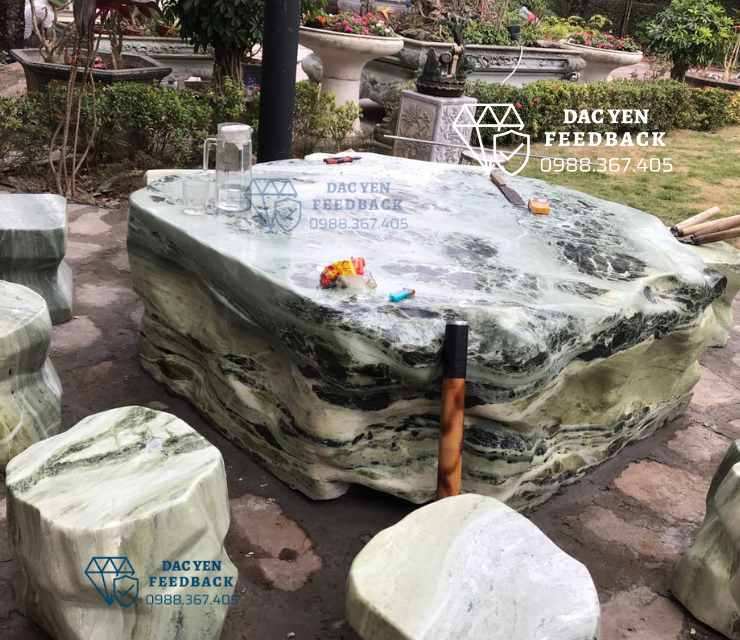 Bộ bàn ghế đá nguyên khối serpentine xanh có nhiều hoa văn đặc sắc