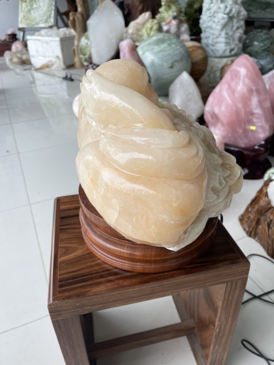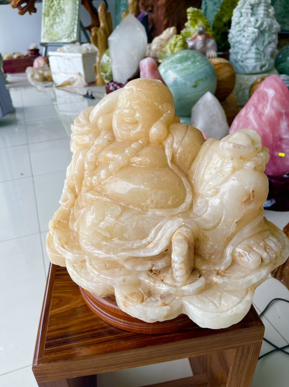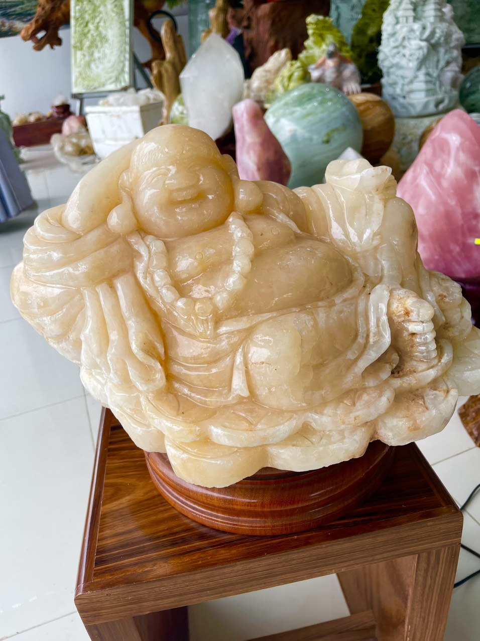 Tượng Phật Di Lặc bằng đá cẩm thạch có xuất xứ từ Trung Quốc vào khoảng thế kỷ thứ 6 hoặc thứ 7. Theo truyền thuyết, Đức Phật Di Lặc là một vị thần đại diện cho sự giàu có, may mắn và hạnh phúc trong đời sống. Vì vậy, tượng Phật Di Lặc được coi là biểu tượng của sự thịnh vượng và tài lộc.