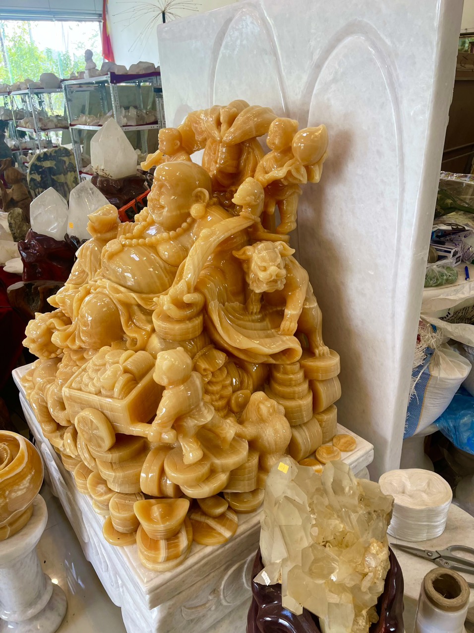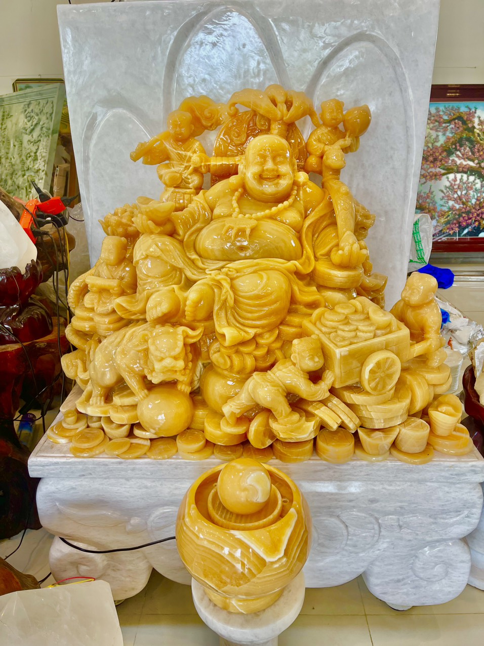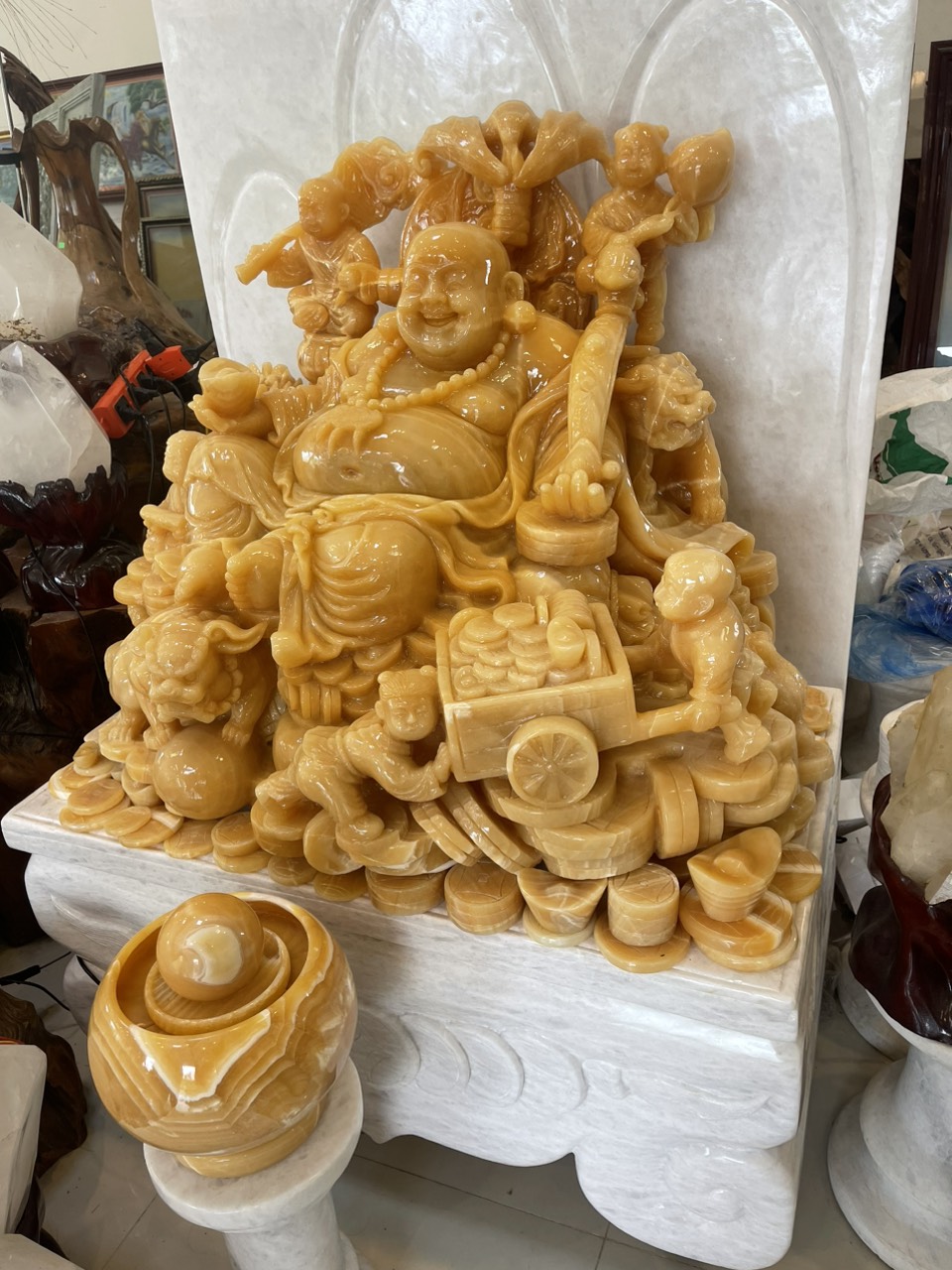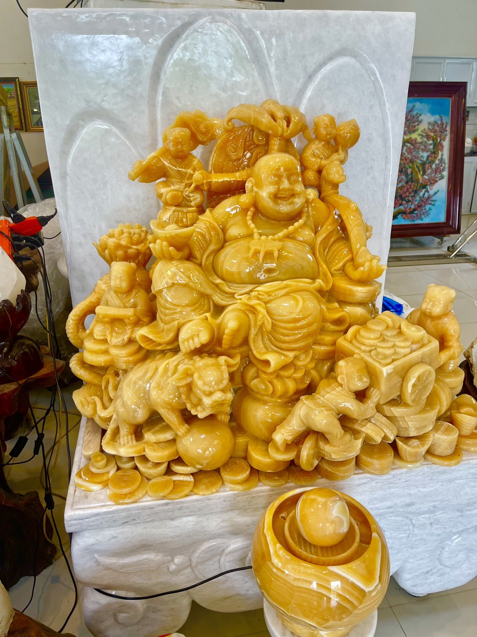 Ngũ phúc song nghê nhất cóc ngọc Hoàng Long tự nhiên nguyên khối, Được điêu khắc thủ công tỷ mỷ và công phu, với dáng ngồi oai phong, bệ vệ, khuân mặt tươi vui, phúc hậu, ngài là chủ trì về tiền bạc và của cải nhìn vào ta thấy sự no đủ, giàu sang phú quý, đây cũng là ước vọng ngàn đời đối với mỗi chúng ta, với củ nhân sâm ngàn năm tuổi tượng trưng cho sức khỏe viên mãn, gậy như ý tương trưng cho mọi việc đều được thuận lợi như ý, 2 Nghê và 1 Cóc tài lộc trầu 2 bên đây là sự chiêu tài hút lộc và chống lại tà khí, tư tưởng âm mưu sấu, Đây thự sự là thần tài của gia chủ mong muốn mang lại cho gia chủ PHÚC, LỘC, THỌ, KHANG, NINH,